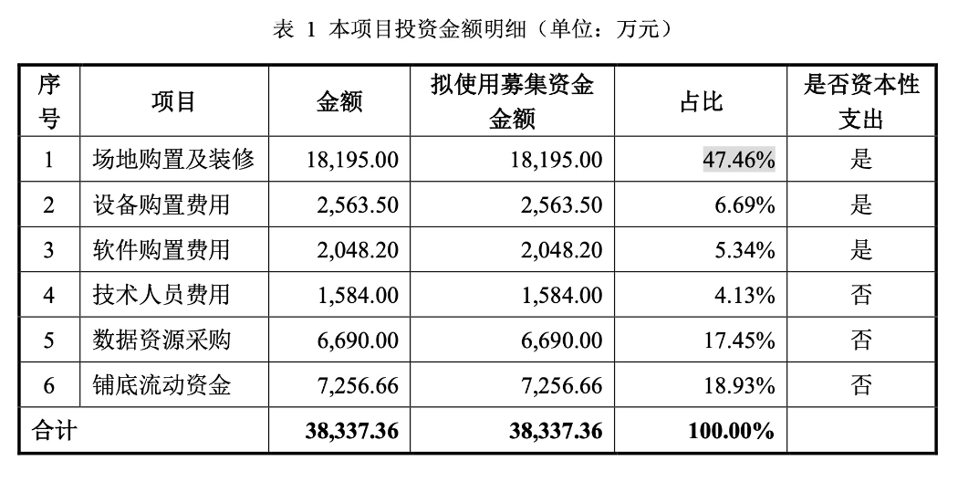 从主营业务来说,海天瑞声比因赛集团“AI含量”更高。此次7.9亿元的定增资金投入两个项目,分别是:AI大模型训练数据集建设项目及数据生产垂直大模型研发项目,拟投入资金分别为3.83亿元及4.07亿元。其中,AI大模型训练数据集建设项目的3.83亿元中,“场地购置及装修”一项资本性支出占比高达47.46%,接近该项目资金的一半,拟使用的募集资金金额高达1.82亿元;合并其“设备购置费用”及“软件购置费用”两项,资本性支出占比高达59.49%。