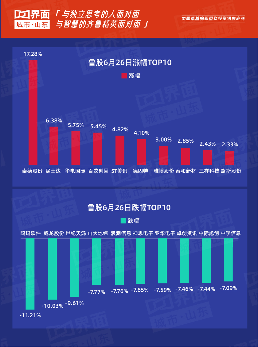 6月26日,山东省内沪深股票有57只个股上涨,238只个股下跌;总市值过千亿的有万华化学(600309)、海尔智家(600690)、兖州煤业(600188)、中际旭创(300308)、中航沈飞(600760)、山东黄金(600547)、潍柴动力(000338)共7家,500亿-1000亿的共有4家,分别是华鲁恒升(600426)、歌尔股份(002241)、浪潮信息(000977)、华电国际(600027)。
