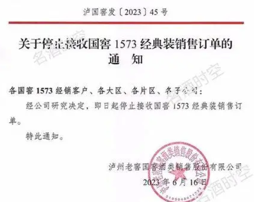 近日,泸州老窖国窖酒类销售股份有限公司发布《关于停止接收国窖1573经典装销售订单的通知》,明确要求国窖1573各经销商客户、各大区、各片区、各子公司,即日起停止接收国窖1573经典装销售订单。