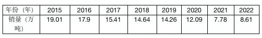 然而在存货量的不断增加的同时,泸州老窖的白酒销量却没有实际增加。2015年销量为19.01万吨,此后一连几年销量断崖式下滑,到2021年仅为7.78吨,直到2022年才有所回暖,但对比2020年及其之前的年销量规模却还存在明显的差距。