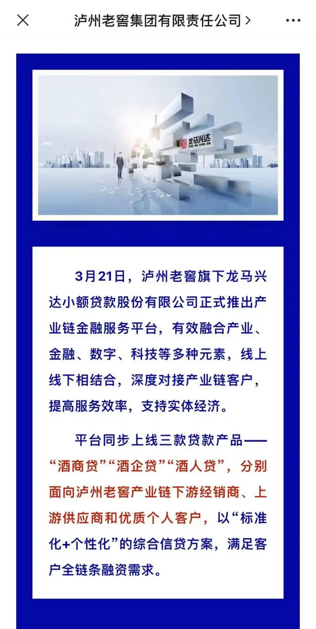 2023年3月末,泸州老窖旗下龙马兴达小额贷款股份有限公司正式推出产业链金融服务平台。随着平台一起推出的,还有三款新产品——“酒商贷”“酒企贷”“酒人贷”。