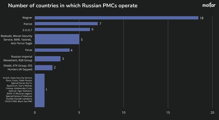 乌克兰顾问公司Molfar统计显示,瓦格纳在全球至少18个国家都有活动,为37家俄罗斯私营军事组织中覆盖面最广。