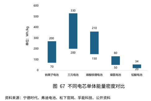 与当前商业化锂电池相比,钠电池能量密度仍有一定差距。较重的钠离子质量和较大的钠离子半径,使钠电池的重量和体积能量密度无法完全与锂电池相媲美。根据相关数据,钠离子电芯质量能量密度约为70-200Wh/kg,而磷酸铁锂电芯质量能量密度为150-210Wh/kg,三元电芯质量能量密度达到200-330Wh/kg。较低的能量密度,将成为制约钠电池在主流动力电池领域应用的主要瓶颈之一。