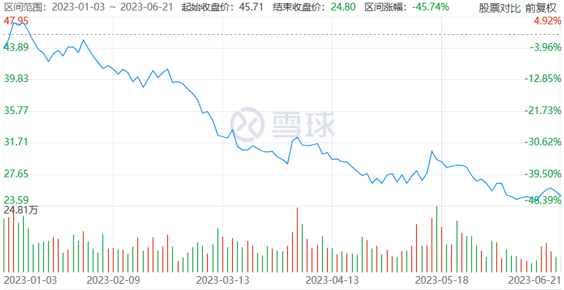 传艺科技的股价也在近半年走熊,截至2023年6月21日,其股价为24.8元,与2022年12月5日的54.44元历史高点相比,已经腰斩。