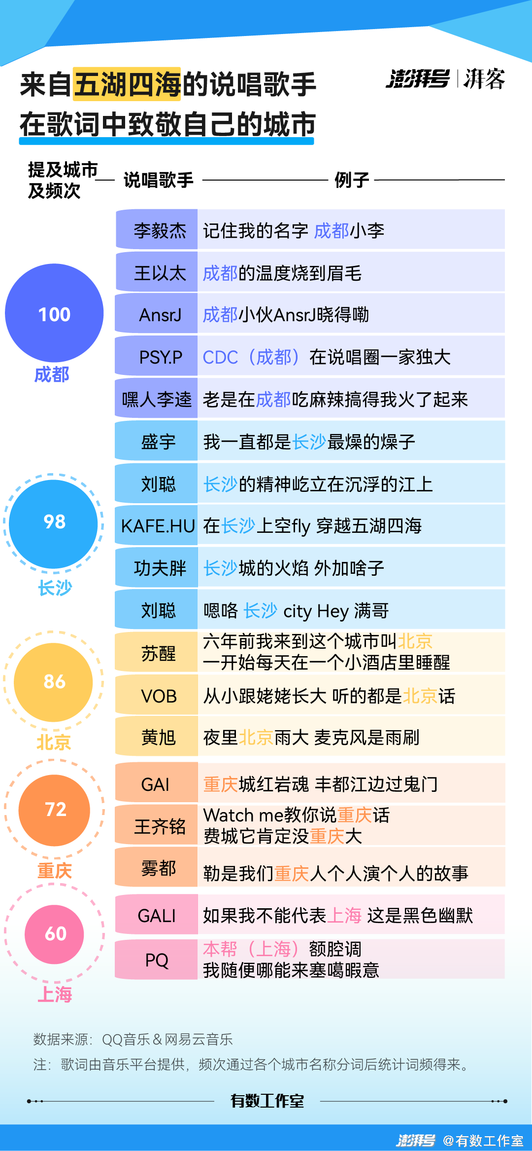 而同样根据澎湃有数工作室的报告显示,在说唱综艺中出现的766 首歌分析中,自我激励和人生态度类作品占比最多,分别达到了 46%和 21%;来自五湖四海的说唱歌手在歌曲中致敬自己的城市,越来越多说唱歌手使用方言。