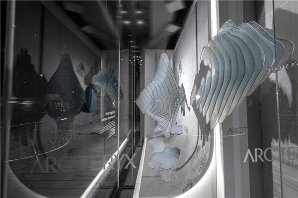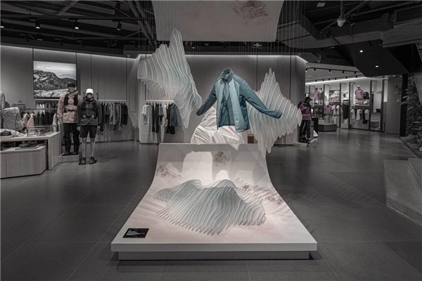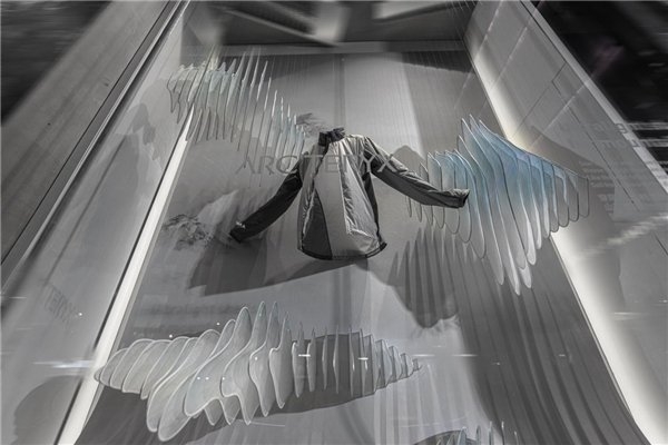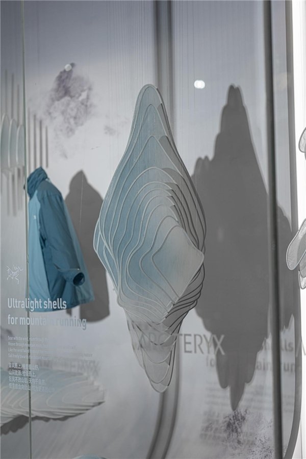 本次橱窗统筹负责人Godien谈到“向远山,Fast Hiking”艺术橱窗,是基于速攀而生的艺术橱窗。速攀作为一项高海拔攀登的极限运动,户外爱好者必须快速完成山峰登顶,并快速地下撤,犹如天空跑(Skyrun-ning)。为了更加契合本次的装置作品,团队特意研发了动态装置《一种橱窗螺旋动态装置》(申请号:202330386508.X) (申请号:202321544187.2)来连接底部的植物纤维山体装置使其前后参差错落运动,配合底部的风动装置来迎接Alpha家族新成员Alpha Jacket。通过这个装置可以充分感受始祖鸟系列产品与自然元素的融合,打造更强沉浸感的山系美学橱窗。