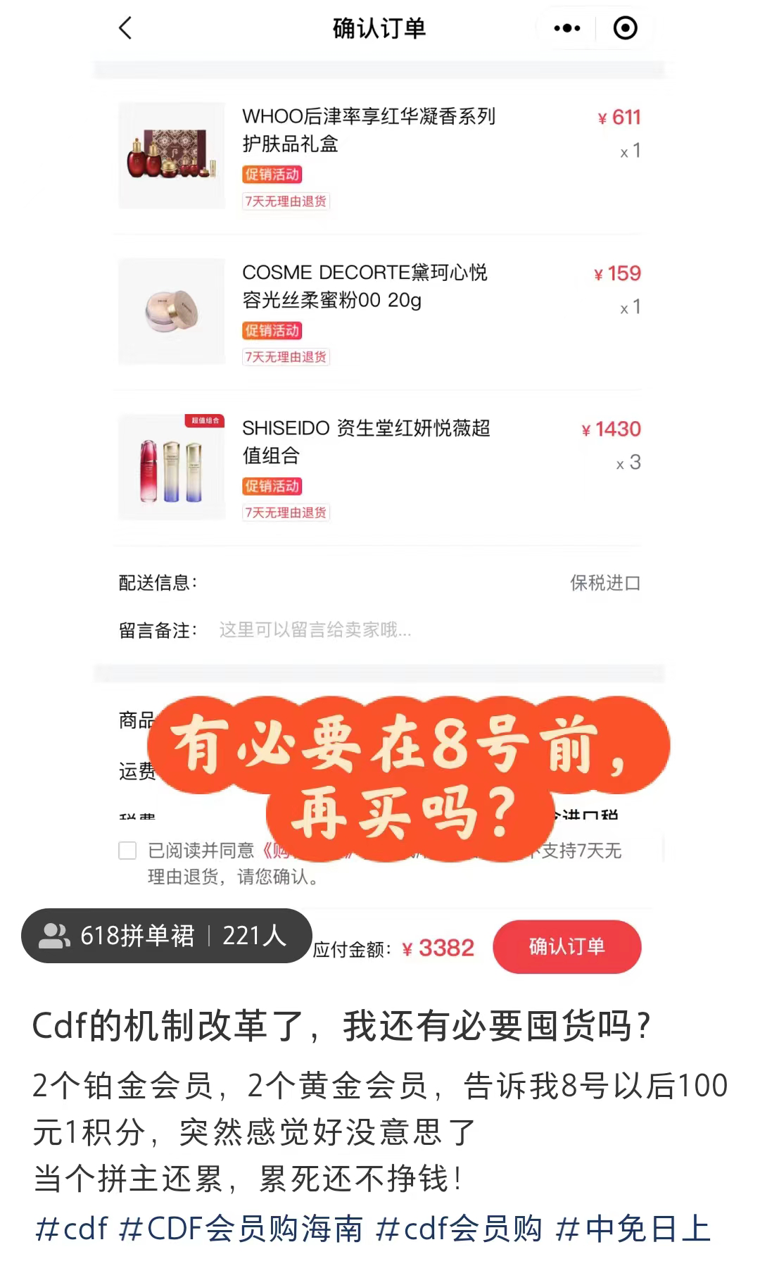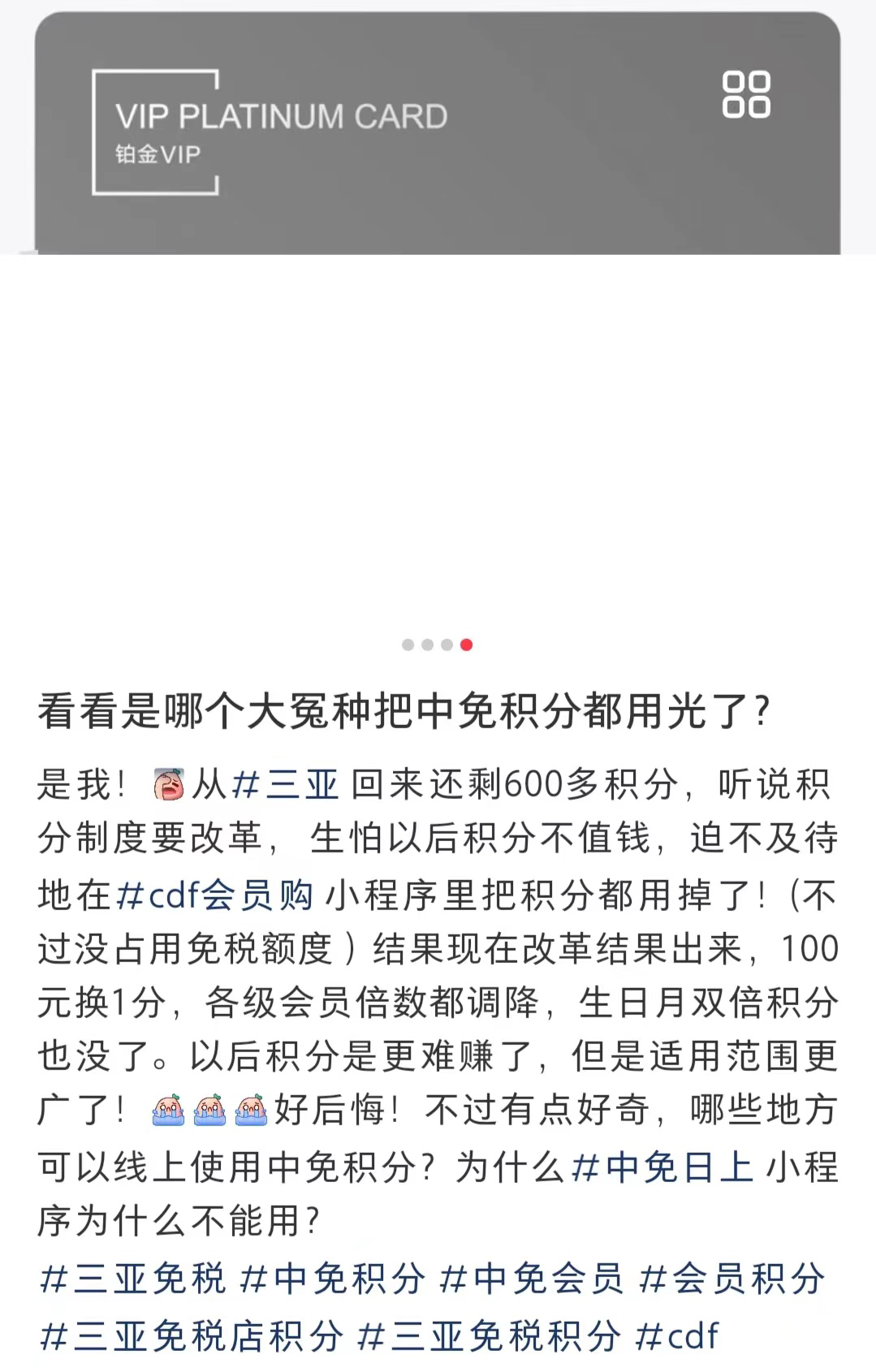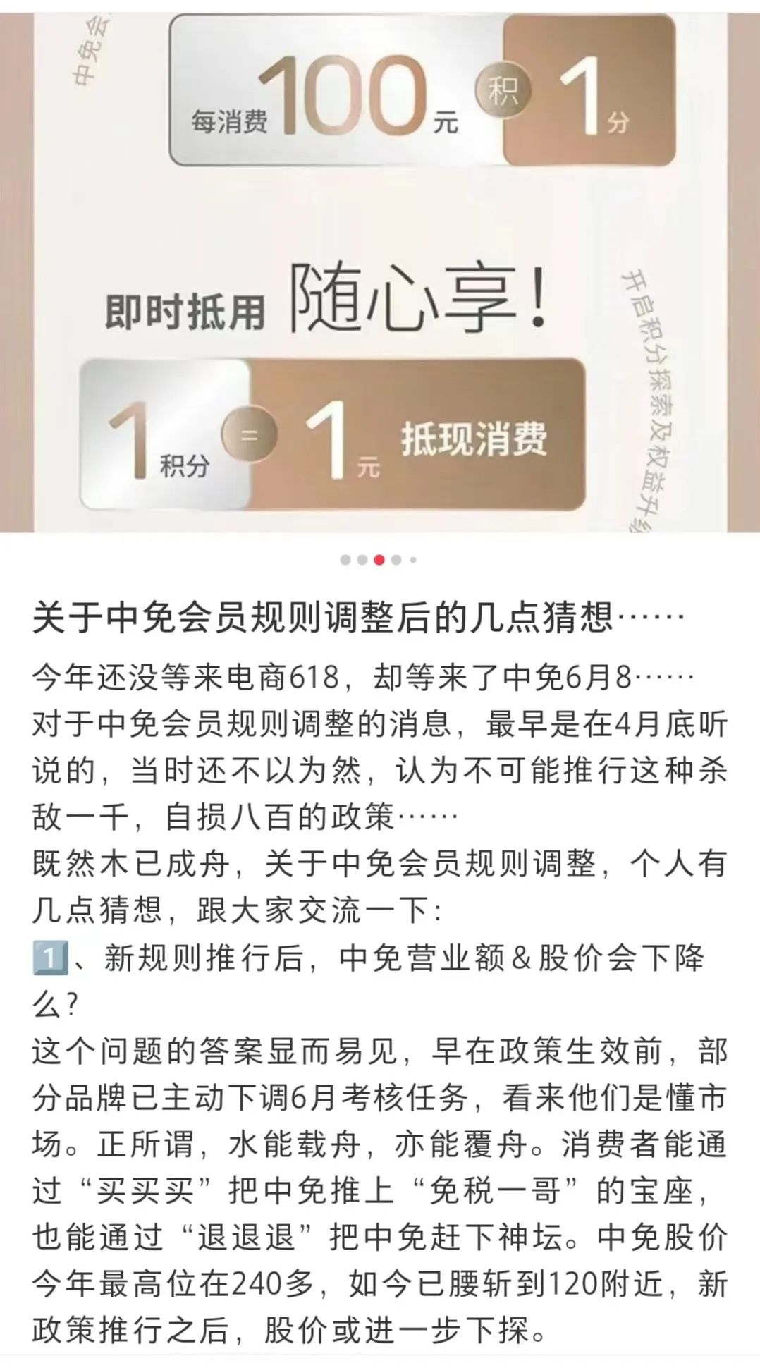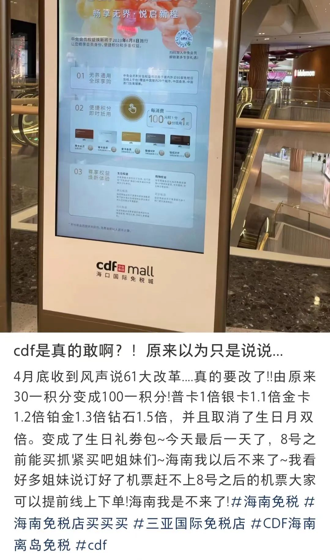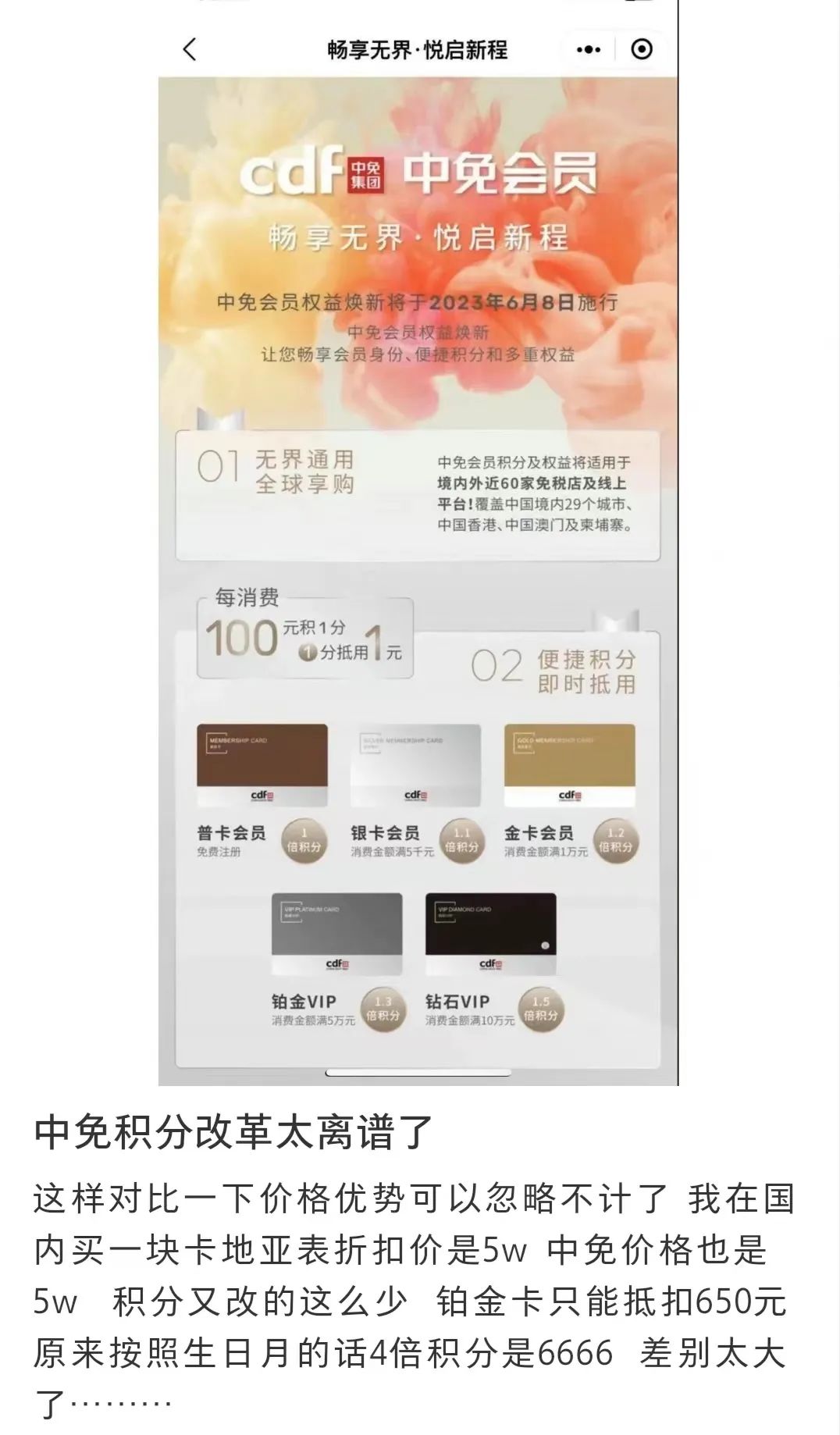 此外,今年6月8日起中免还将实施新的会员积分规则,此前每消费30元积1分,规则更改后需要消费100元才能积累1分,不同等级会员的积分加倍规则也遭到降低,不少中免的会员对新规则感到非常失望,认为中免是在“自废武功”。