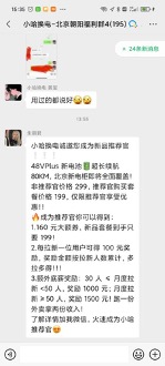 补贴、拉新费在其他品牌也同样存在。外卖员李亮向记者展示了小哈换电北京的换电价格,成为新品推荐官购买单月套餐仅199元,同时拉新一位可获100元奖励,并且拉新达到30人、50人还有额外奖励。其表示,他已经使用这锂换电半年了,如果价格合适会考虑更换小哈换电。