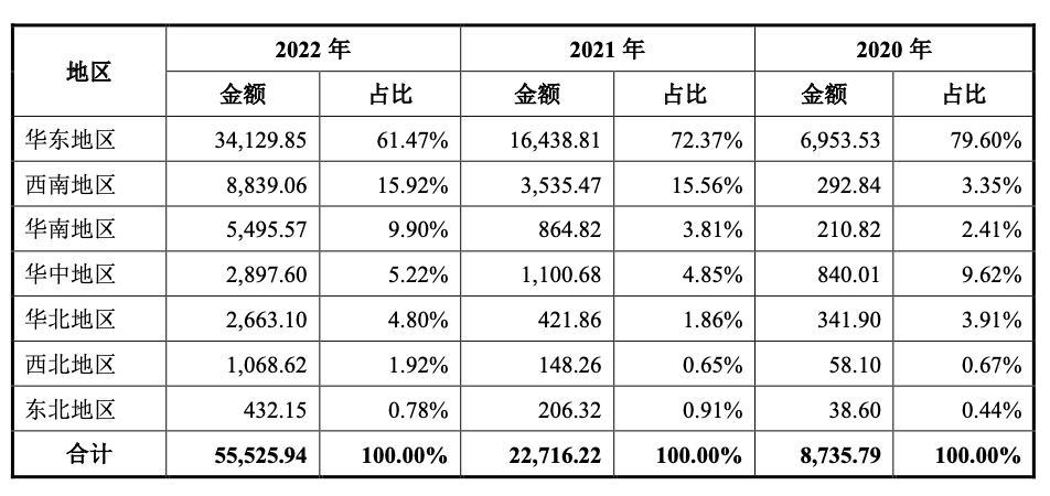 报告期内,宇谷科技业务主要集中在华东地区和西南地区,二者各年合计主营业务收入占比均在75%以上,主要原因系公司业务在杭州和成都布局较早并不断向周边城市拓展。另外,2022年,华南地区增速较快,主要原因是公司着力开拓华南市场,新增开拓东莞、广州、佛山等城市。
