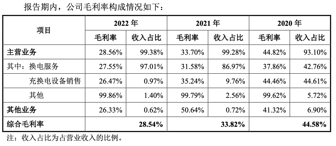 另外,宇谷科技的毛利率也在不断下滑。报告期内,公司综合毛利率分别为44.58%、33.82%和28.54%。公司解释称,主要在于换电服务、充换电设备销售毛利率均有所下降,以及毛利率较低的换电服务业务收入占比逐年增加,其中自主运营模式的换电服务毛利率分别为34.62%、29.15%、25.28%。