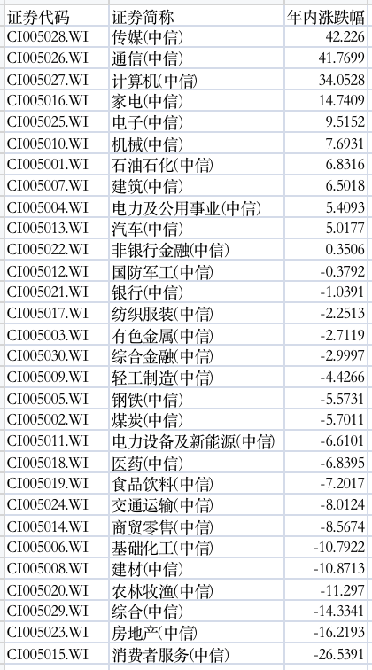 截至目前,中信30个一级子行业中,涨幅前5位的行业分别为传媒42.27%、通信涨41.77%、计算机涨34.05%、家电涨14.74%和电子涨9.52%;跌幅前5位的行业分别为消费者服务-26.54%、房地产-16.22%、综合-14.33%、农林牧渔-11.30%和基础化工-10.79%。