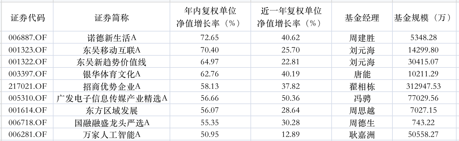 根据wind数据,有1844只主动权益基金取得正收益,其中9只甚至超过50%。诺德新生活A、东吴移动互联A、东吴新趋势价值线混合收益率前三,分别达到了72.65%、70.40%、64.97%。