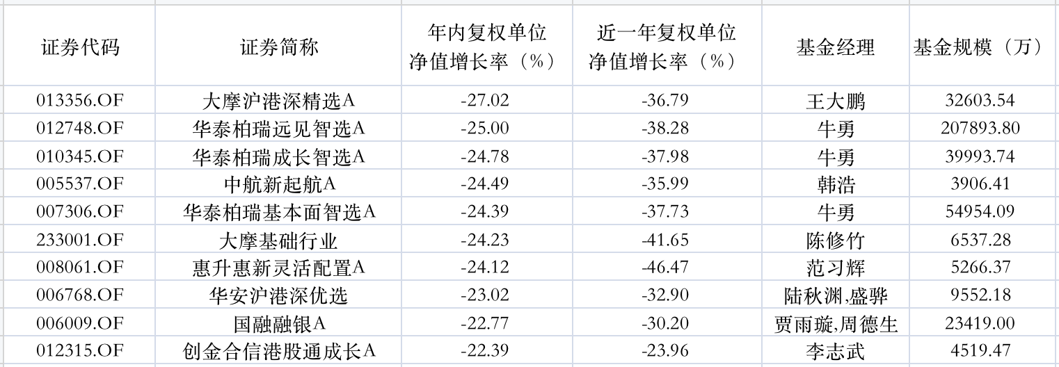 大摩沪港深精选混合A、华泰柏瑞远见智选A、华泰柏瑞成长智选混合A、中航新起航A等跌幅比较靠前。