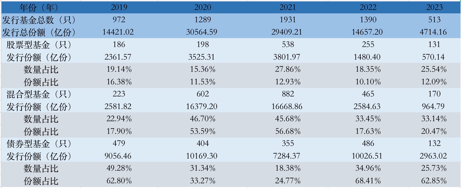 从基金类别来看,在权益市场行情低迷时,往往混合型基金和股票型基金发行承压,债券型基金更受市场欢迎。今年内债券型基金的发行数量为132只,份额占比为62.85%,与2019年和2022年情况相似。