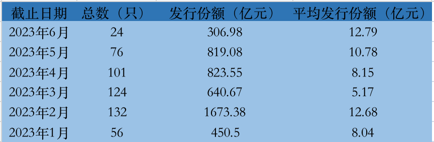 排除1月份春节假期影响,今年以来发行情况一路走低, 6月份已掉入冰点,当月新成立24只,发行份额为306.98亿元。