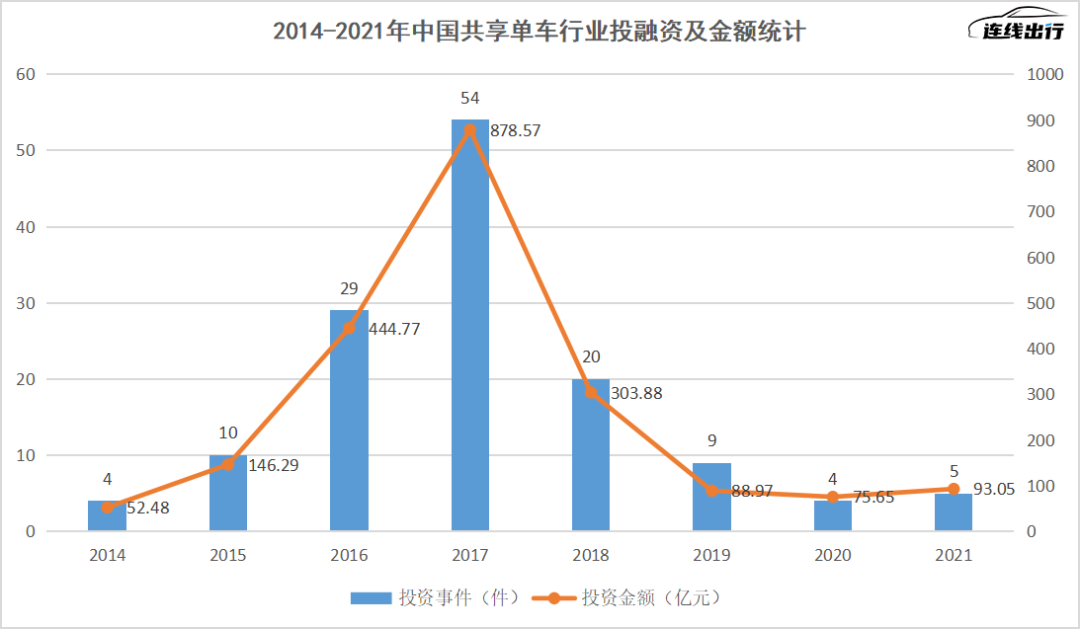2014-2021年中国共享单车领域投资事件及投资金额统计,数据来源于观研报告网,连线出行制图