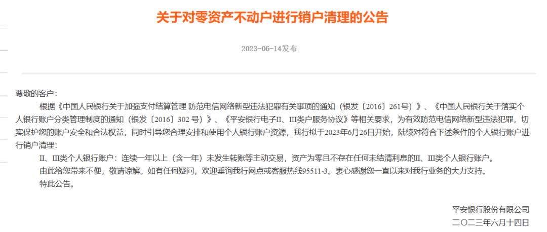 随着“睡眠账户”引起的风险加剧及监管要求,越来越多的银行加入清理队列。近日「支付百科」注意到,平安银行发布清理Ⅱ、Ⅲ类个人银行账户:连续一年以上(含一年)未发生转账等主动交易,资产为零且不存在任何未结清利息的Ⅱ、Ⅲ类个人银行账户。