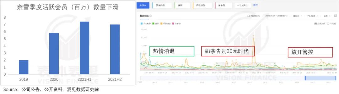 数据显示,2021年下半年,大家对喜茶、奈雪的关注度就开始下降。同时可以看到,奈雪的茶季度活跃会员数量,也出现下滑。