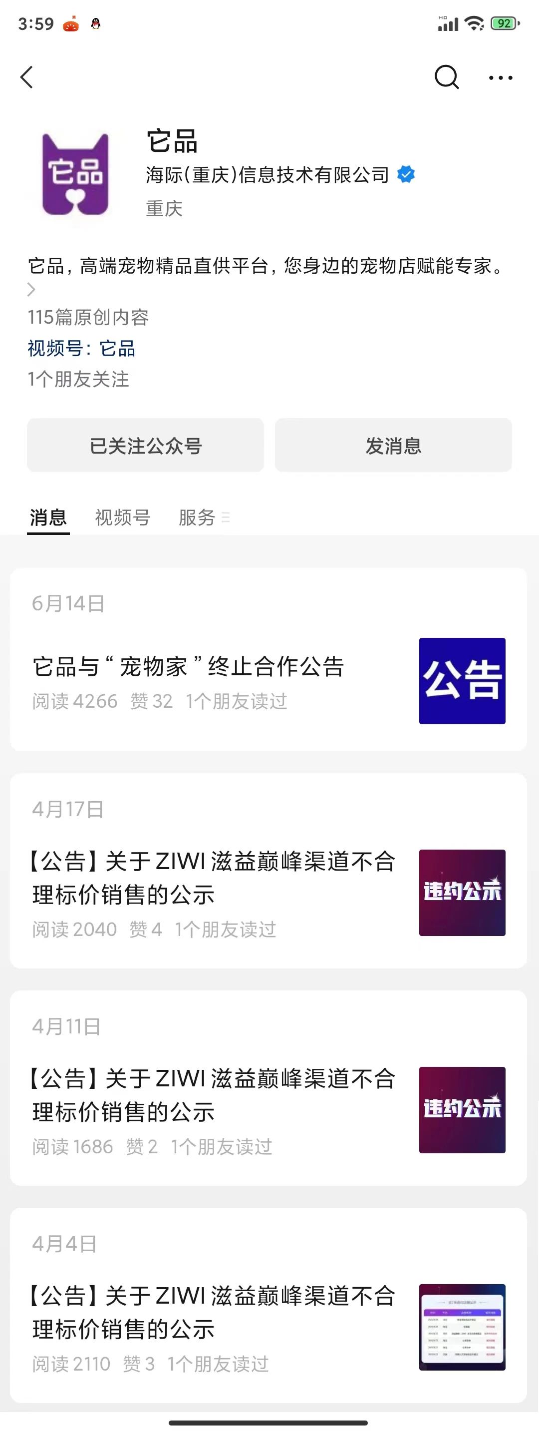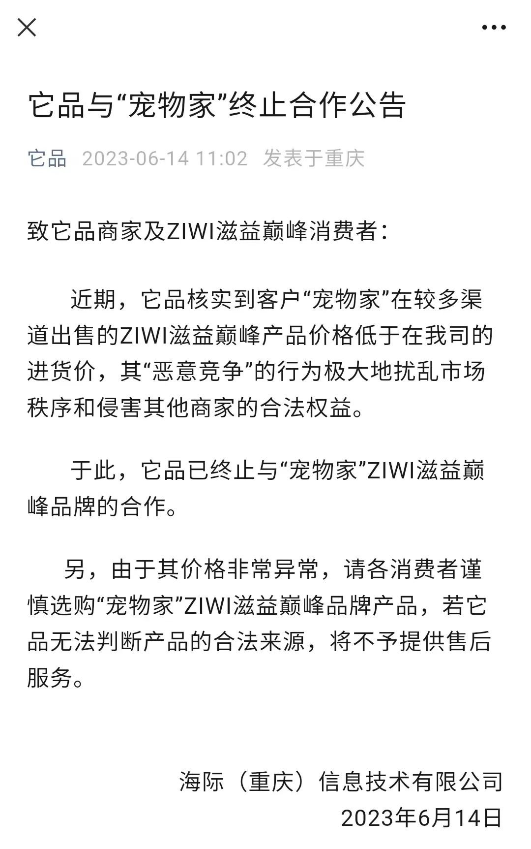 6月14日,主打“互联网+进口宠物商贸”的海际它品在公众号上发布了公告,称“近期,它品核实到客户‘宠物家’在较多渠道出售的ZIWI滋益巅峰产品价格低于在我司的进货价,其‘恶性竞争’的行为极大地扰乱市场秩序和侵害其他商家的合法权益。”并宣布,“它品已终止与宠物家ZIWI滋溢巅峰品牌的合作”。