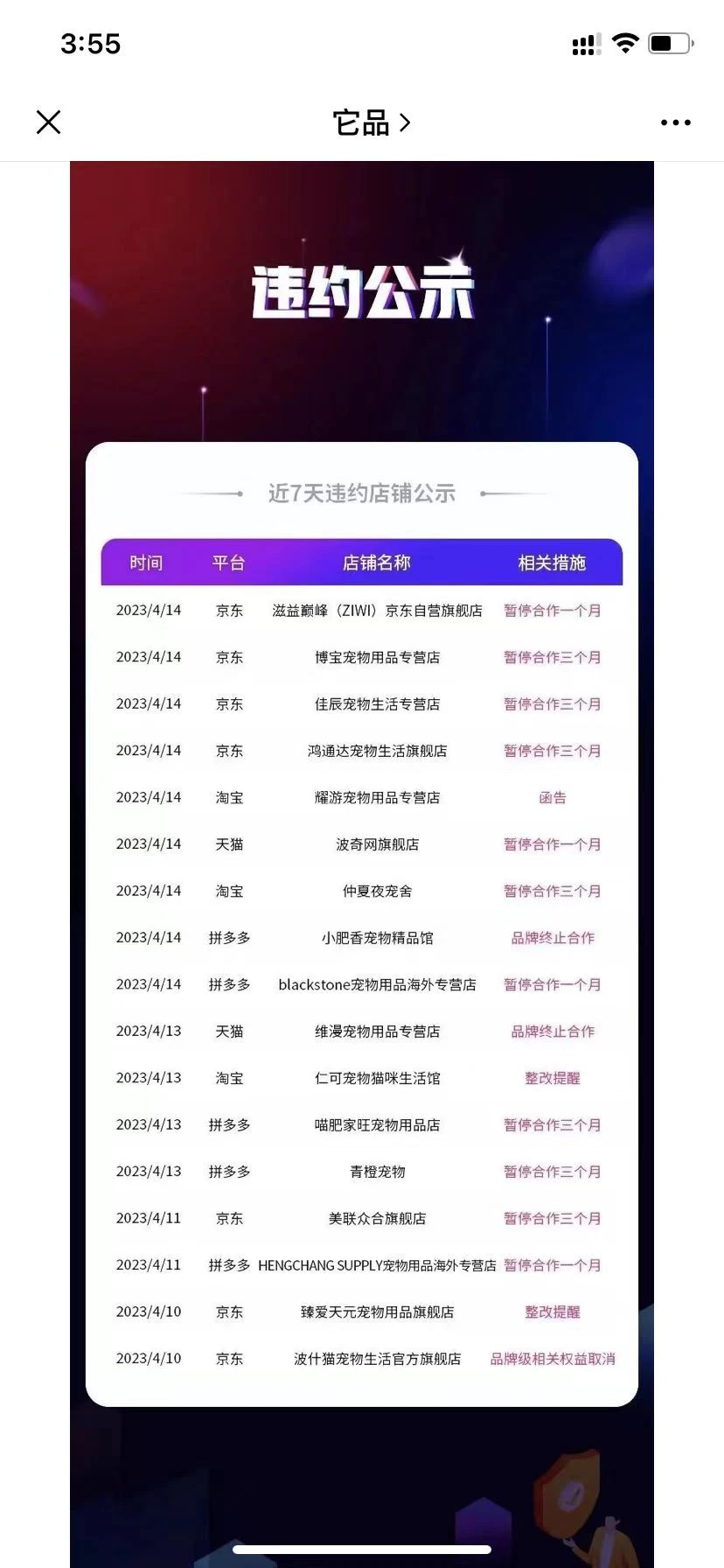 所不同的是,之前的公示是集中列出诸如天猫“波奇网旗舰店”“滋益巅峰(ZIWI)京东自营旗舰店”拼多多“青橙宠物”等零售店,相关措施多为“暂停合作三个月”“整改提醒”等。直接公告与某零售商终止合作的,尚属首次。