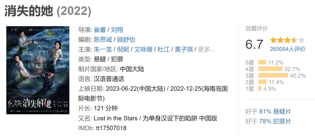 从这个角度来说,《消失的她》其实与《误杀》系列一脉相承,只是创作切口从亲情转变为爱情、闺蜜情,创作方向延伸至女性题材。然而,首次涉足新领域,从逻辑漏洞到最后“狗血”的B超,《消失的她》面临的争议更大。目前,随着观影群体扩大,影片豆瓣评分从7.5分一路下降至6.7分。