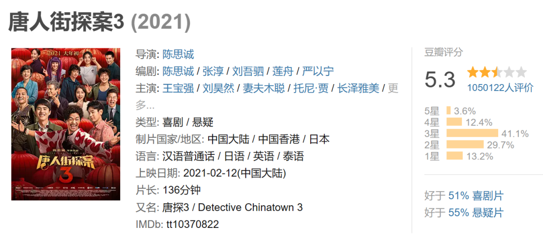 此前,《唐探3》豆瓣评分跌至及格线以下时,一个重要原因便在于片中的推理部分较以往大打折扣,拼凑的笑点和令人不适的玩梗也引发大面积争议。后来的《误杀Ⅱ》以及当前正上映的《消失的她》,同样呈现出推理上的薄弱。然而,这些影片本身以悬疑为基础,推理部分崩盘便很难让观众信服并代入其中,这也是《唐探》系列、《误杀》系列近几年口碑整体下滑的关键所在。