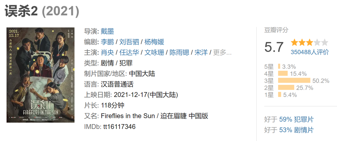 后来的《误杀Ⅱ》,悬疑方面的呈现较上一部弱了许多,两部作品也是各自独立的故事,但《误杀Ⅱ》保留了亲情的视角,在阶层对立之外又引入医患关系的社会议题。并且需要注意的是,当时的市场反馈中,无论是影片对“误杀”的诠释、不合理的情节,还是强行煽情等,观众都对《误杀Ⅱ》抱有诸多争议。但是,影片对小人物的呈现、对“伟大父亲”的塑造还是成为击中大众情绪的切口,最终,在影片口碑跌至5.7分的情况下,《误杀Ⅱ》仍拿到超11亿票房。