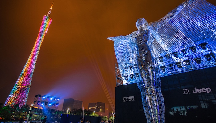 距离广州车展正式开幕还有一天两夜,珠江江畔的海心沙亚运公园灯火通明。稍稍抬眼,伫立于一旁的广州塔正在温暖潮湿的空气中完成色彩的流转,“Jeep广州造、南粤新王牌”的广告标语在高空中循环着出现接着飘走。