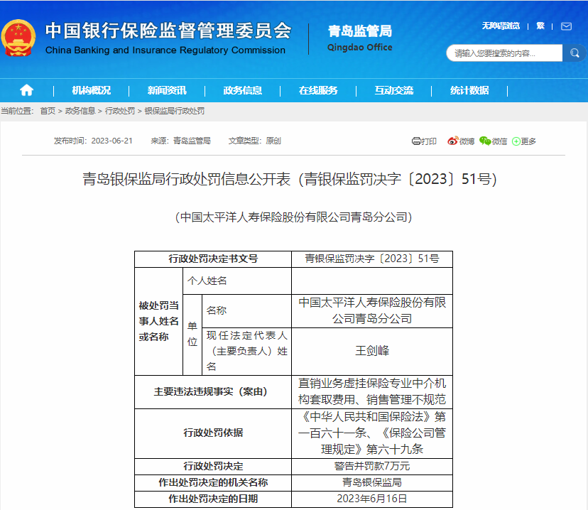 近日,青岛银保监局对中国太平洋人寿保险股份有限公司青岛分公司(以下简称“太平洋人寿青岛分公司”)作出行政处罚,因直销业务虚挂保险专业中介机构套取费用、销售管理不规范,太平洋人寿青岛分公司被警告并罚款7万元。