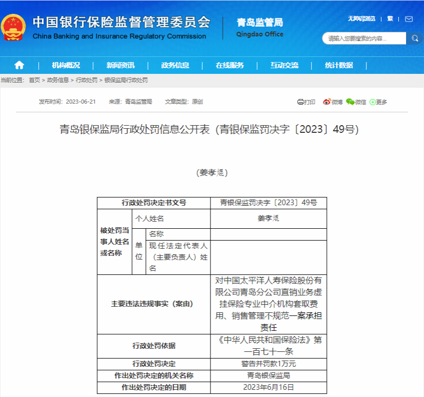 原标题:太平洋人寿青岛分公司被罚