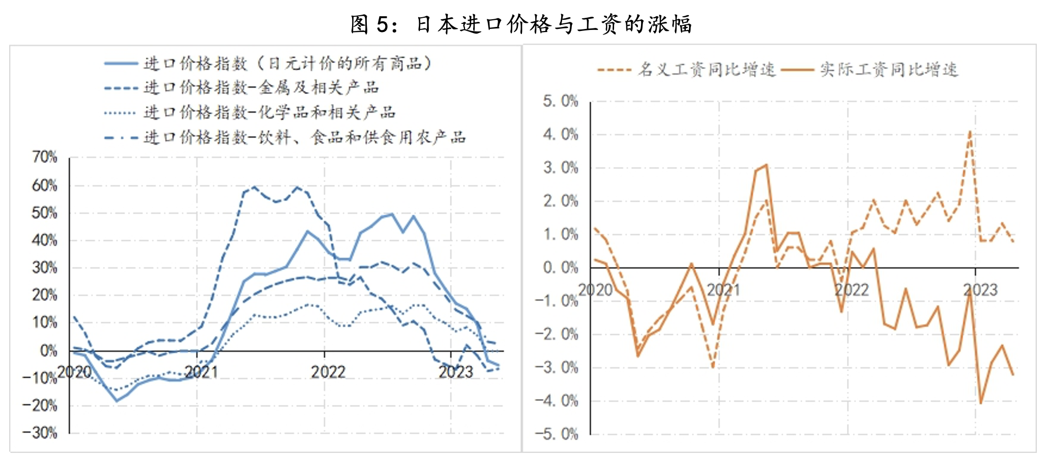 因而,从CPI分项的物价变动情况来看,日本的物价上行更多体现为内外因素推动下的供给冲击,尚未呈现出需求推动下的物价普遍持续上涨。不过潜在的通胀压力确实也是存在的,2019年末至2023年5月期间,日本不包括新鲜食品与能源的CPI累计涨幅已升至4%。