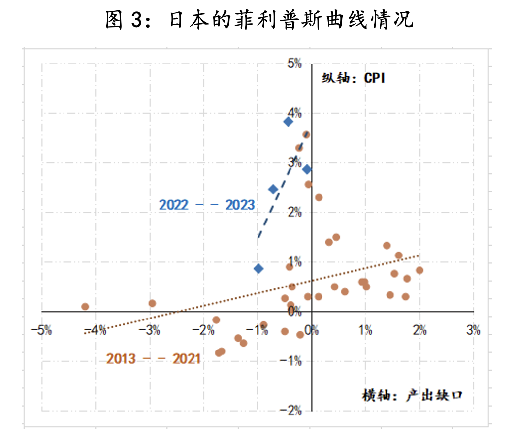 如图3显示,2013年以来日本央行实施了极为宽松货币政策(包括零/负利率、QQE、YCC等),直至疫情管控结束期间,日本的菲利普斯曲线保持着相对扁平的状态——通缩压力更大,但2022年以来,日本的菲利普斯曲线发生了显著变化,即通胀快速回升,经济的产出缺口同步开始快速修复。