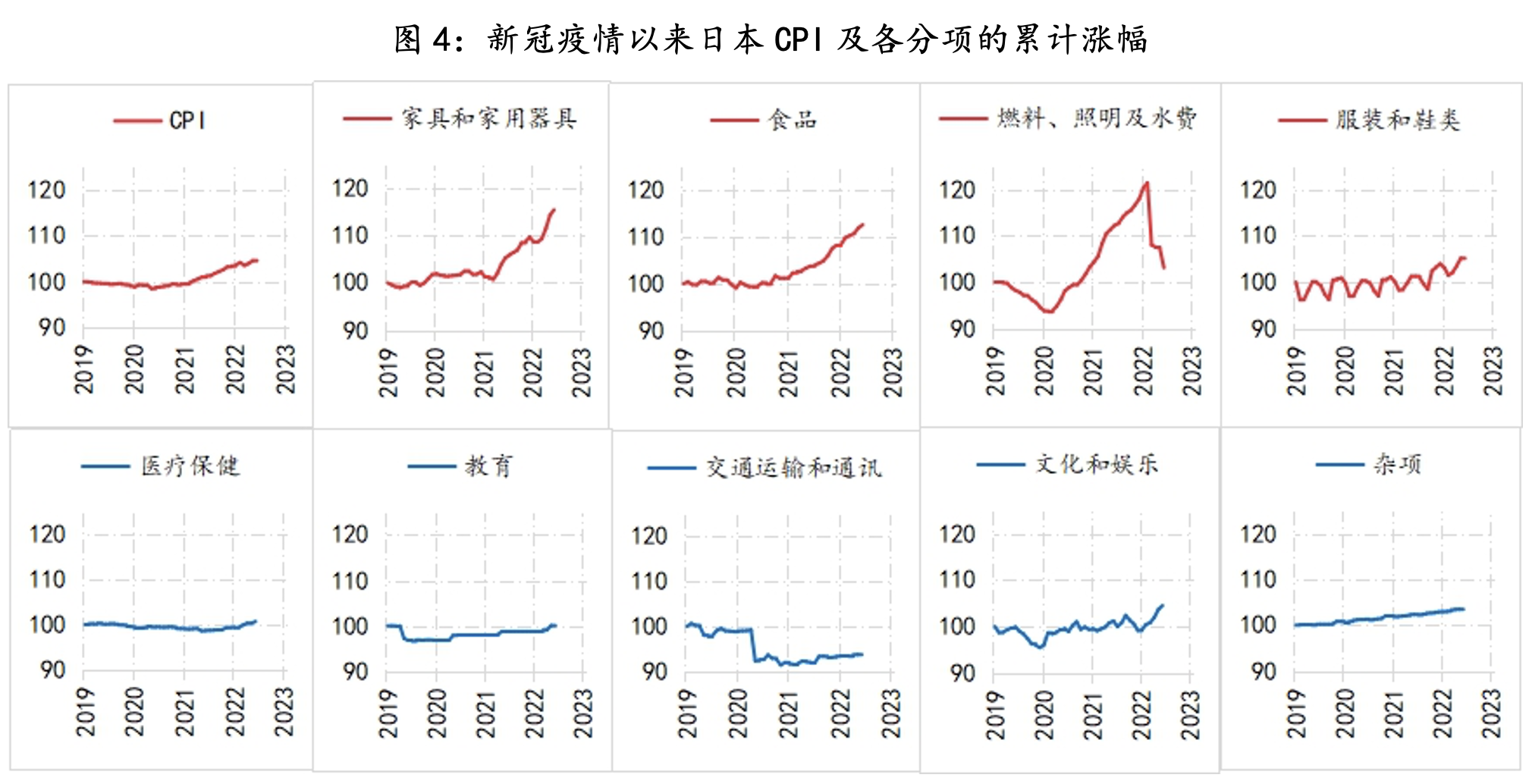 其次,当前日本物价水平的上行更多源自供给冲击。为了更好地观察本次日本经济承受的通胀压力,集中观察了疫情以来日本CPI以及分项的累计变化情况(以2019年底为基数100)。截至5月末,日本CPI累计上涨了4.7%,其中,耐用品与食品累计涨幅最高,分别为15.4%、12.5%,燃料累计涨幅也一度高达21.4%,目前已回落至3.1%;其余项的涨幅则有限,住房累计涨了2.3%、服装累计涨了5.2%、耐用品累计涨了5.4%、文娱累计涨了4.5%、医疗累计涨了0.7%、杂项累计涨了3.6%、而交通通讯累计变化幅度为-6.1%。