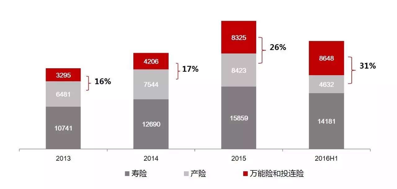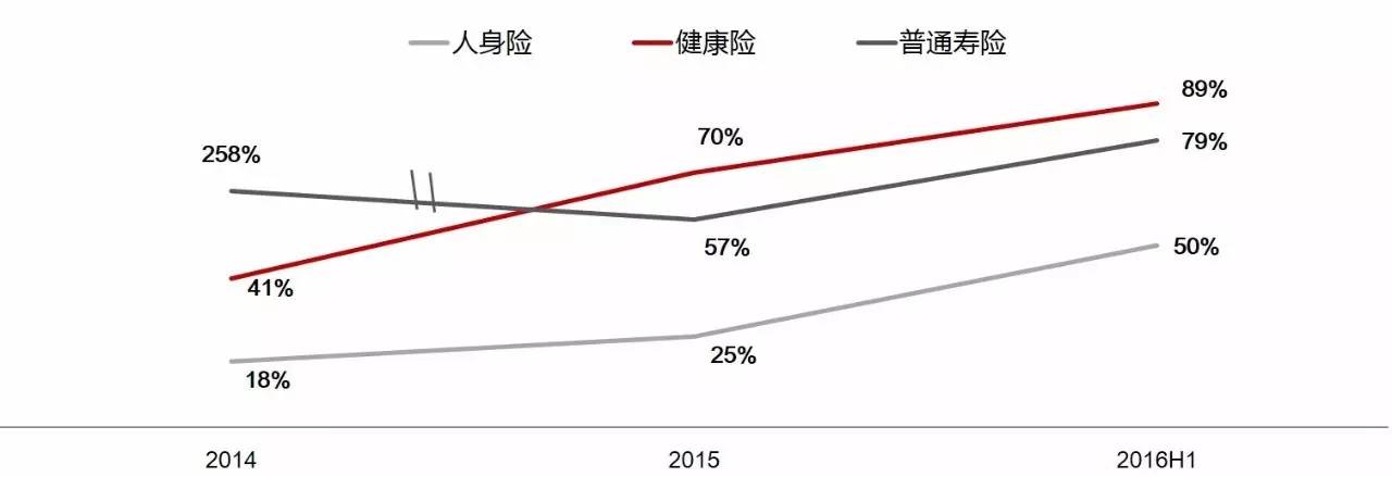而有另外两类产品,一个是普通寿险(相对于分红险,是更强调保障功能的),2015和2016H1的增速分别是57%和79%;一个是健康险(纯保障),2015和2016H1的增速分别是70%和89%,掩映在整体市场37%的增速中,两者的增速并没有吸引市场太多关注。但他们并不依赖投资驱动,且增速逐步加快,势必在未来扮演愈发重要的角色,我们认为这主要还是归结于居民保障的需求的觉醒,这种不可逆转的觉醒将成为行业长期的增长的动力。