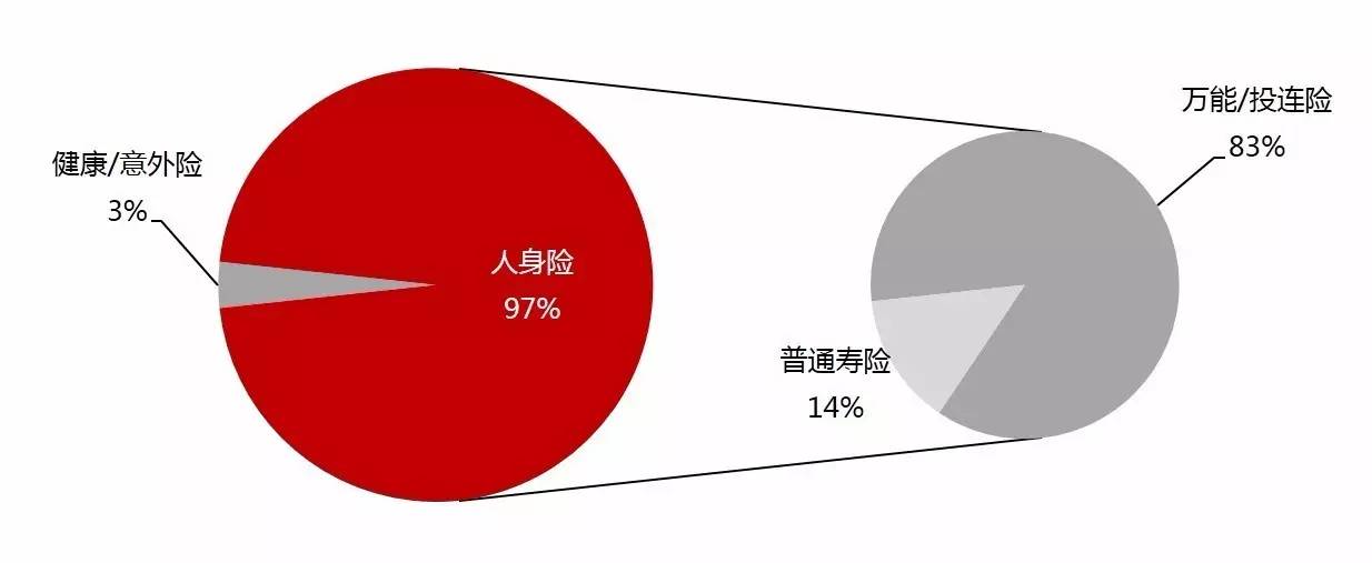 自2011年以来,互联网保费规模从32亿元,4年的时间翻了69倍,2015年收入高达2234亿元,渗透率达到了9.2%。然而,拆细来看,1466亿人身险中83%即1219亿都是万能险/投连险;768亿财险中81%都是从官方渠道卖出来的车险。总而言之,真正来自纯粹保障型/互联网/创业公司贡献的量仍非常有限。即使考虑到今年的增长,渗透率应该都还在5%左右。