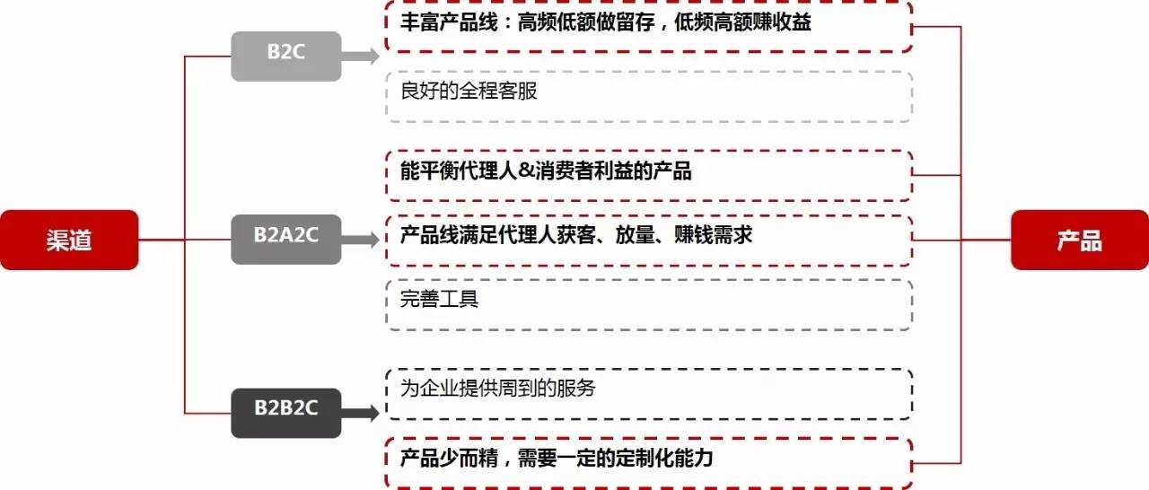 在B2Agent2C的模式中,完善代理人工具固然重要,但最关键还是要用费差吸引代理人,激励越高越好。所以在B2Agent2C的模式里,需选择在消费者受益和费差间平衡的产品,产品未必如B2C那样丰富,但能满足代理人获客、放量、赚钱的需求,对代理人工具完善,适度对消费者进行跟踪。