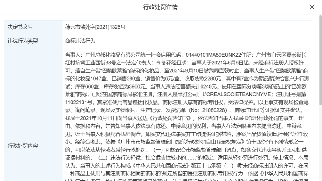 在盗用“巴黎欧莱雅”商标这件事上,该公司并非是首犯。早在2021年10月份,其因为未经商标注册人授权许可,擅自生产带“巴黎欧莱雅”商标的化妆品,涉及“商标侵权”的违法行为而被广州市白云区市场监督管理局罚款了1.5万元。