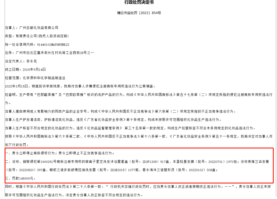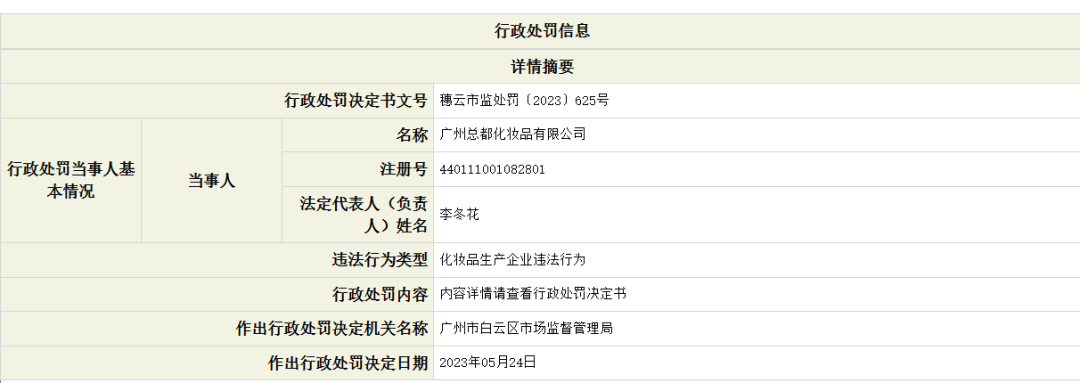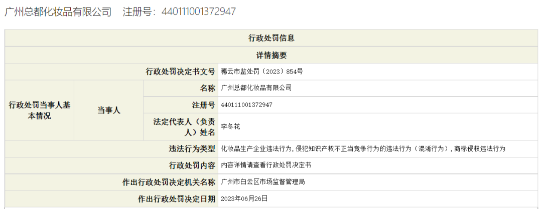 6月26日,广州市市场监督管理局官网新增了一则行政处罚信息:广州总都化妆品有限公司涉及化妆品生产企业违法行为、侵犯知识产权不正当竞争行为的违法行为(混淆行为)和商标侵权违法行为共三项“罪名”,被罚款14.6万元。