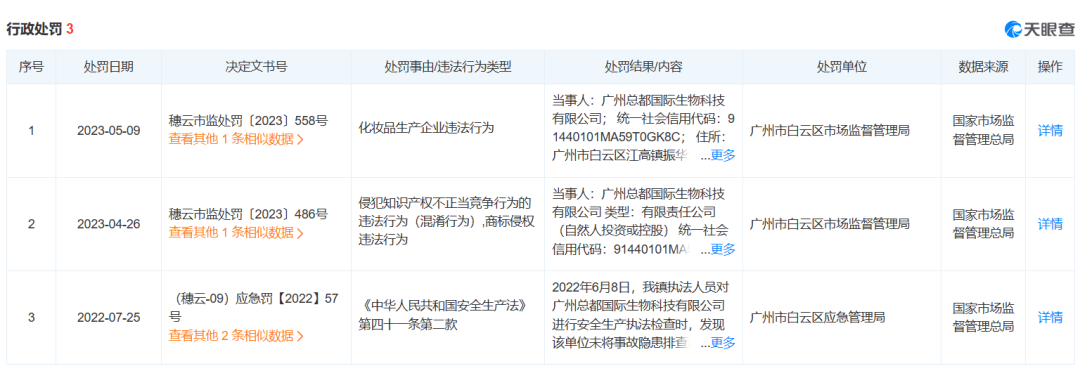 在行政处罚方面,这两家关联公司也保持着“高度一致”的步伐。除了多次冒用“巴黎欧莱雅”的标签之外,广州总都国际生物科技有限公司还触及化妆品生产不合规等违法行为。
