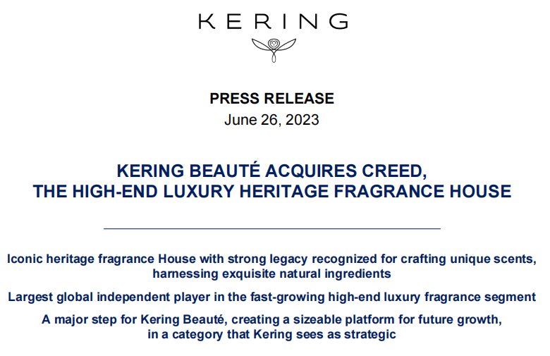6月26日,全球高端精品集团开云集团宣布已签署协议,将从BlackRock长期私募基金和Javier Ferrán控制的基金中收购高端香水品牌Creed100%的股份。