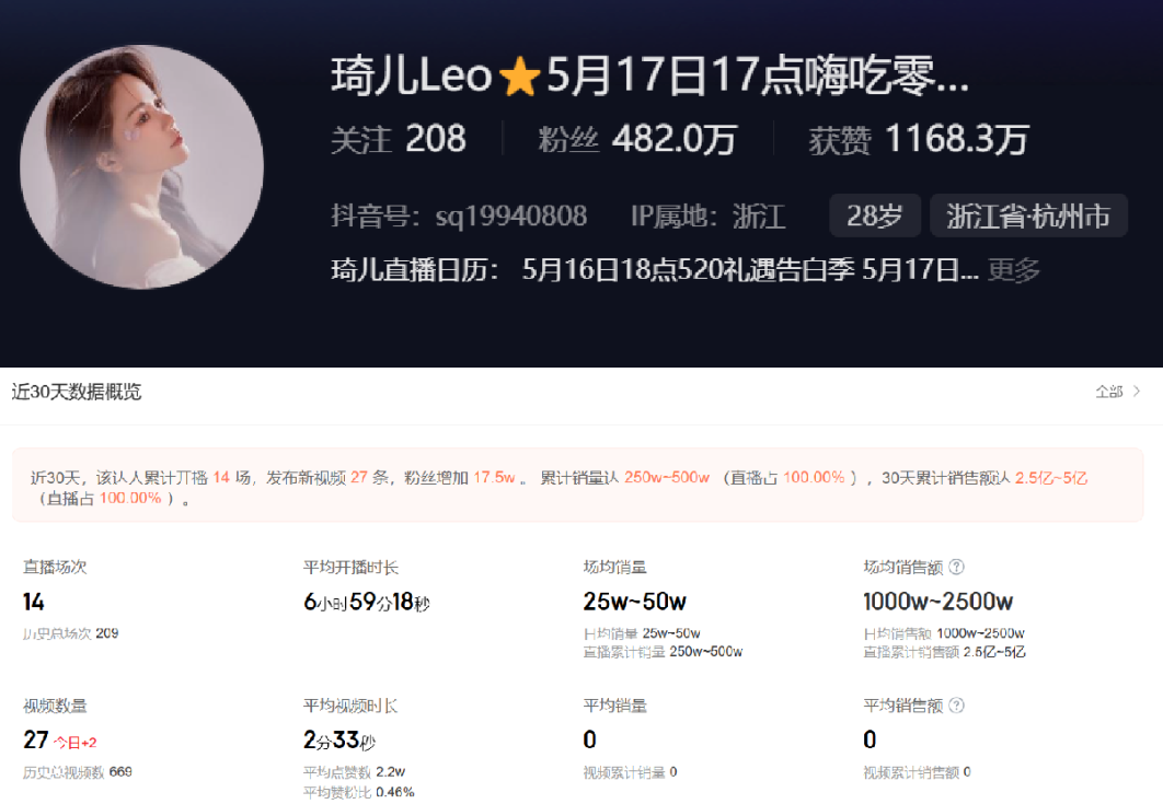 琦儿Leo抖音主页及最近带货数据,图/抖音APP、蝉妈妈数据