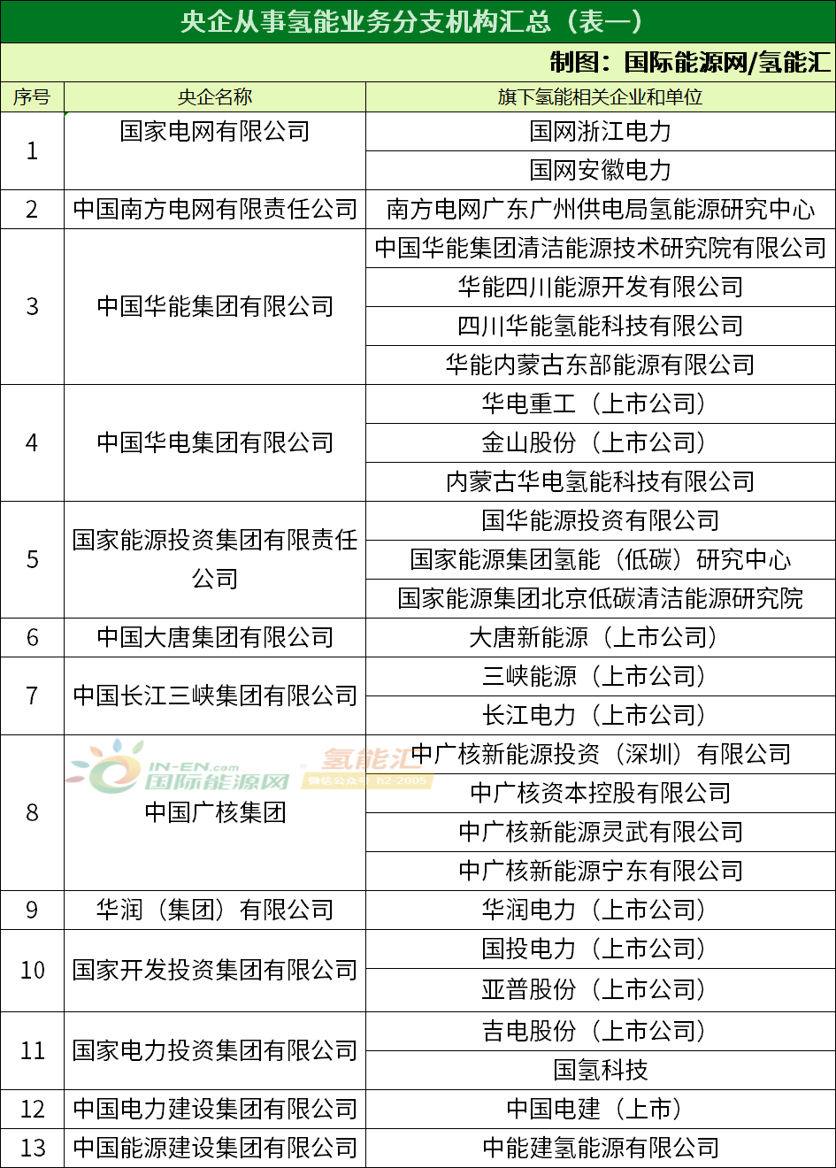 在地方国企中,也有大量企业进入氢能领域,在各地开发氢能项目。氢能汇分两期对央国企中涉及氢能业务的子企业及项目进行汇总。此为第一篇,以能源电力央企为核心:
