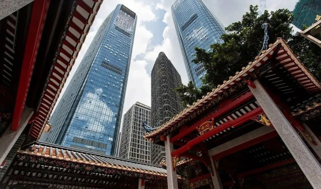 并且,华润置地还做到了将传统庙宇、街区商业、高端办公和住宅、学校的有机结合,周边在保留了旧村郑氏宗祠、大王古庙、大涌石以及古榕树等历史文化遗产的同时,以“潮”为底色,打造了“一街一巷五广场”的建筑布局,进一步诠释了城市的有机更新和持续进化的肌理与内涵。