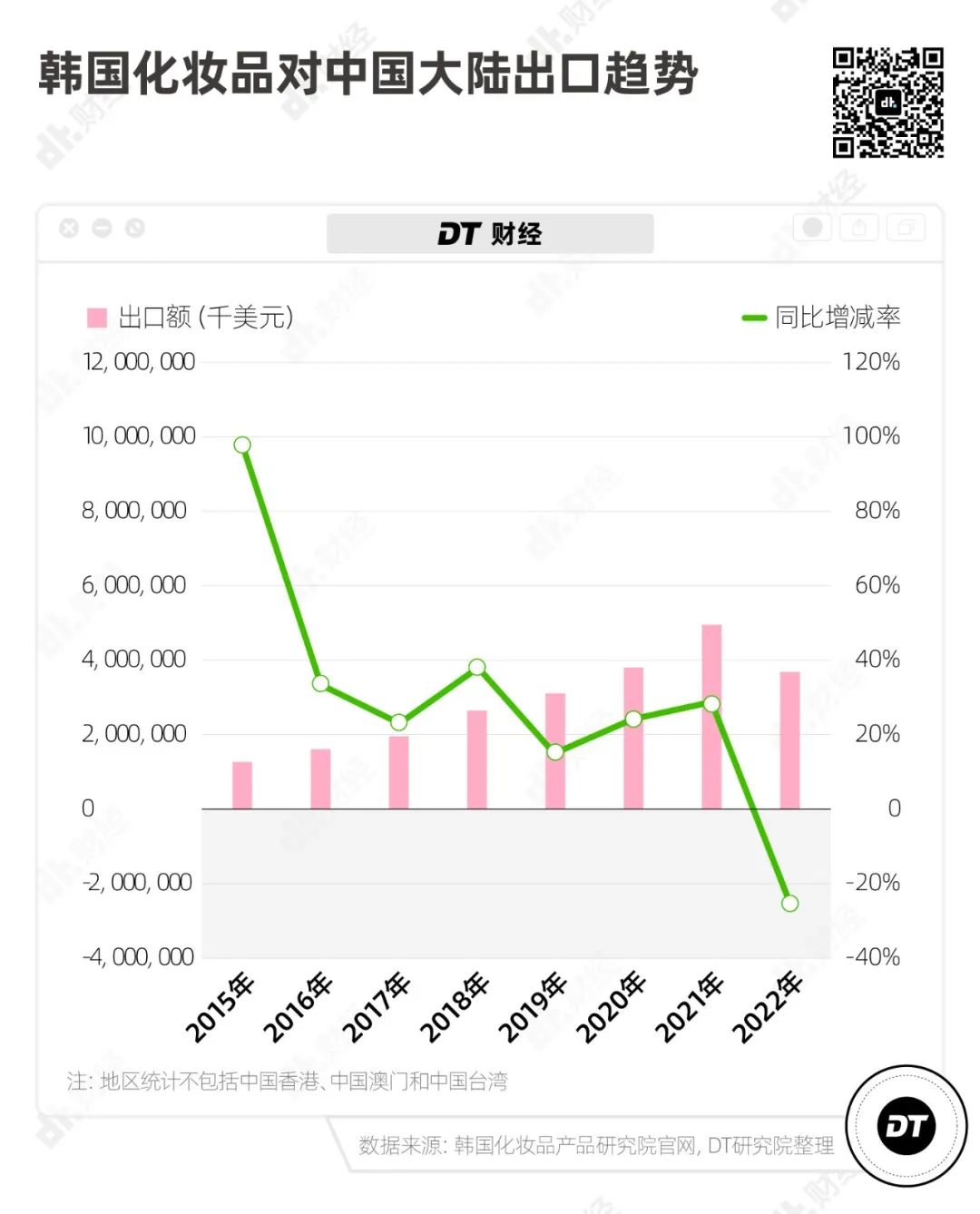 韩国化妆品产品研究院的数据显示,2015年韩国化妆品对华出口接近翻倍增长,此后几度下滑,2019年增长率仅15.3%。在疫情影响下,2022年韩妆对华出口增长率首度为负。