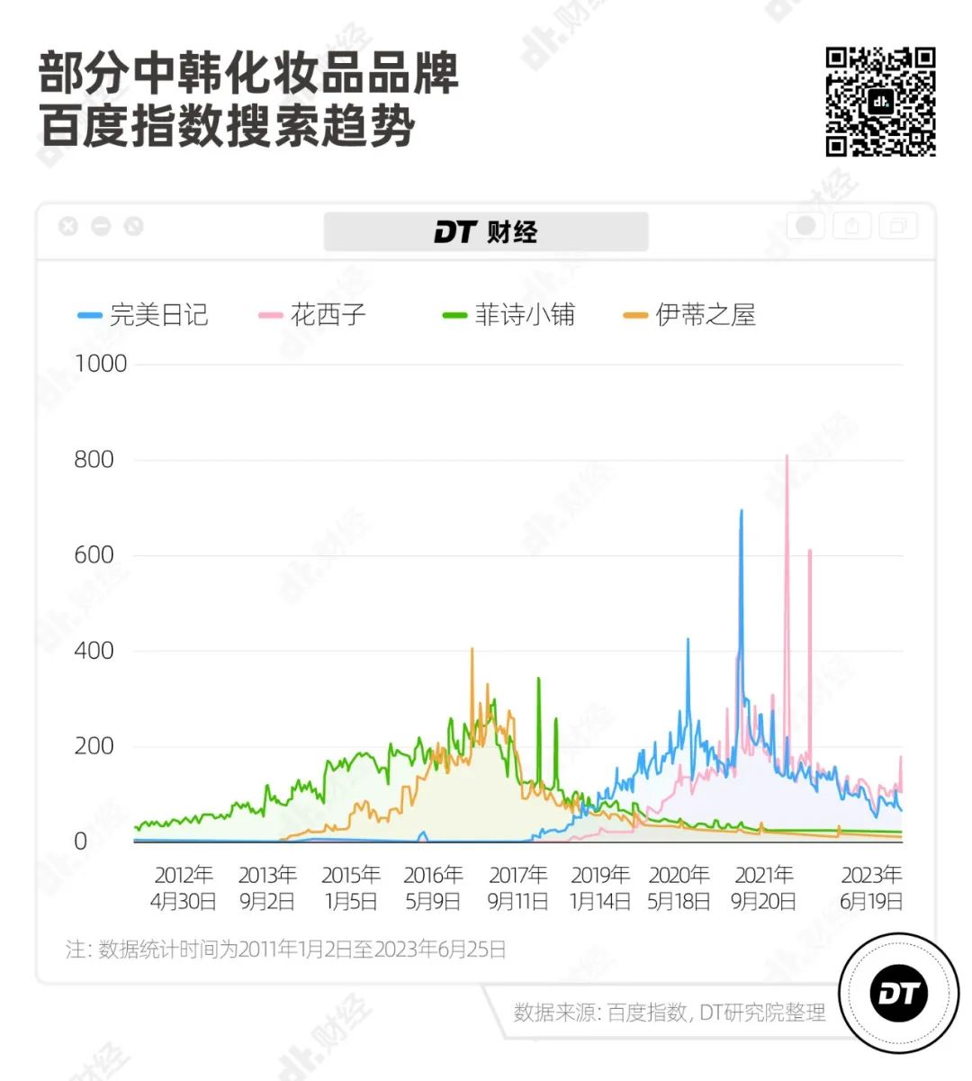 数据也佐证了这一趋势,热门韩妆品牌的中文互联网声量在2015-2017年达到顶峰,随后下降。随后,完美日记、花西子等国产品牌接替韩妆品牌,成为互联网热门。