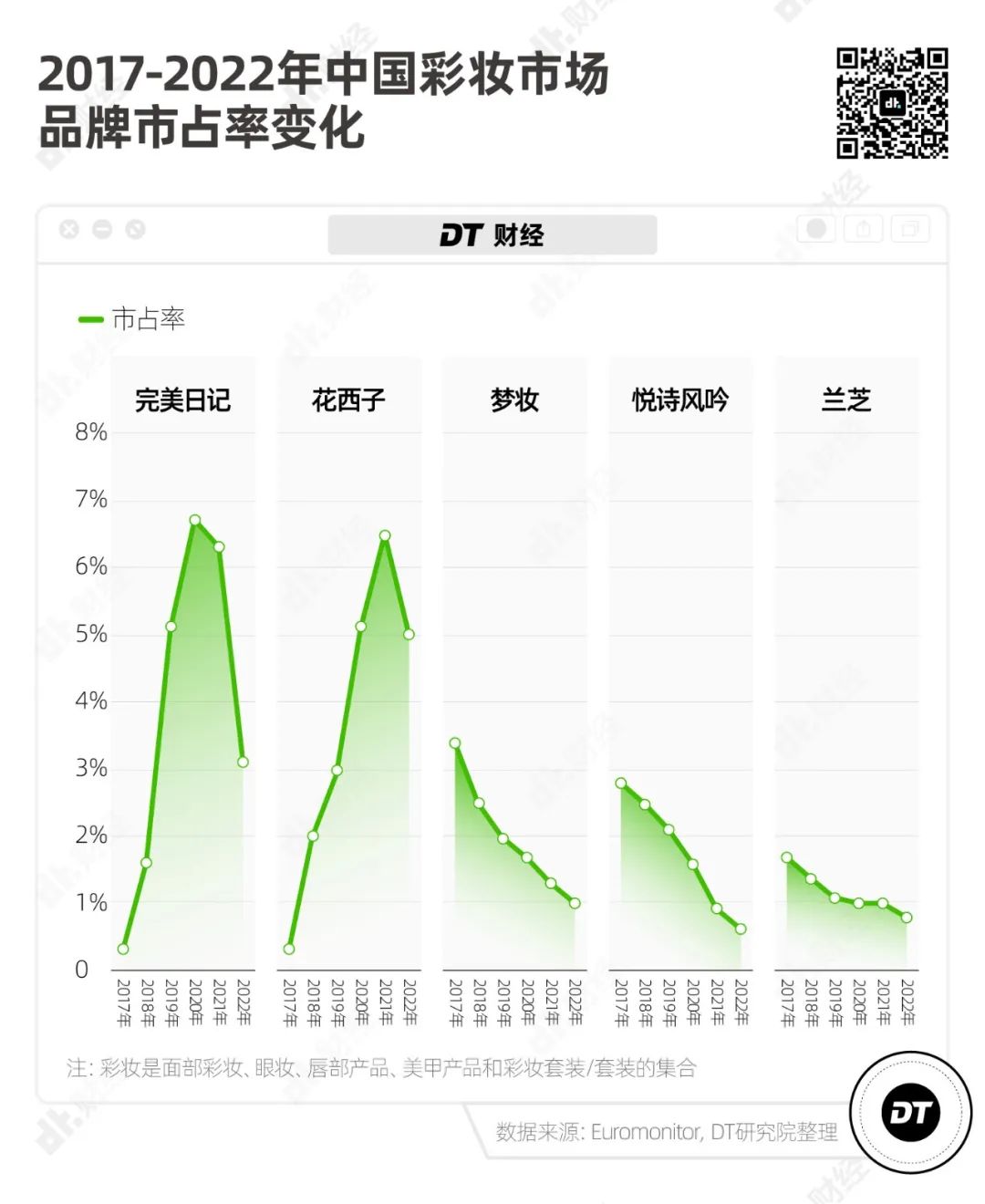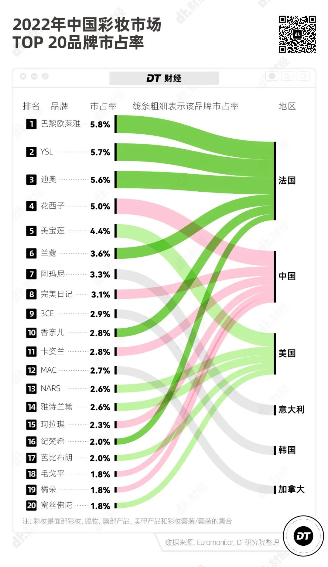 DT财经查阅欧睿国际数据库了解到,2022年中国彩妆市场占有率TOP20品牌中,共有6个国产品牌,分别是花西子、完美日子、卡姿兰、珂拉琪、毛戈平、橘朵。唯一上榜的韩国品牌3CE,早在2018年就已经被欧莱雅集团收购。