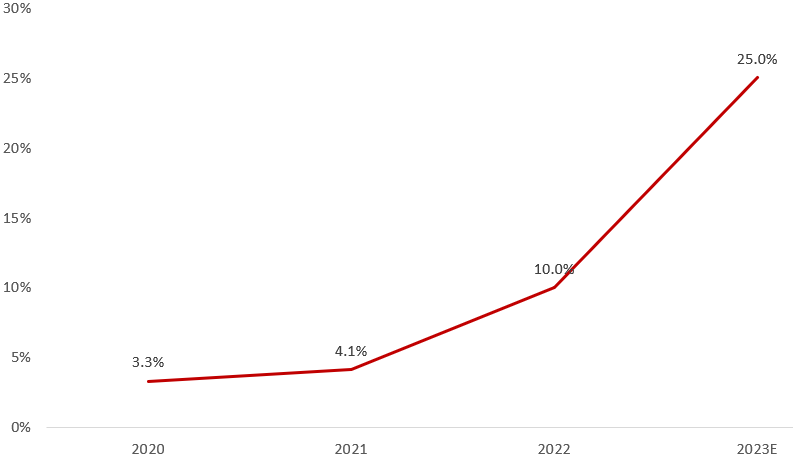 预计到2023年底,隆基的N型产能最高才能达到30GW;而此时,隆基的硅片总产能预计将达到190GW,N型占比不到16%。