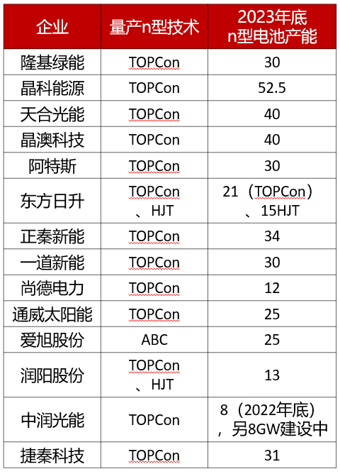 头部企业N型电池产能情况(单位:GW),来源:北极星太阳能光伏网