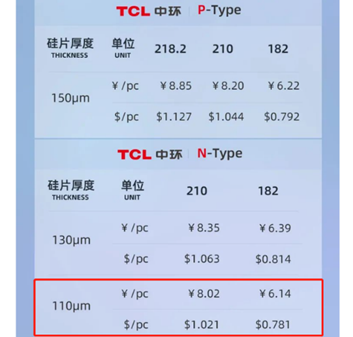 2022年5月19日,TCL中环推出N型硅片,硅片厚度减薄至130微米。今年3月,根据TCL中环硅片报价显示,N型硅片已经再度减薄至110微米,并且在价格上低于P型硅片,实现了NP同价。