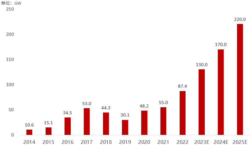 中国光伏装机量统计与预测,数据来源:中国光伏业协会和首创证券研究所
